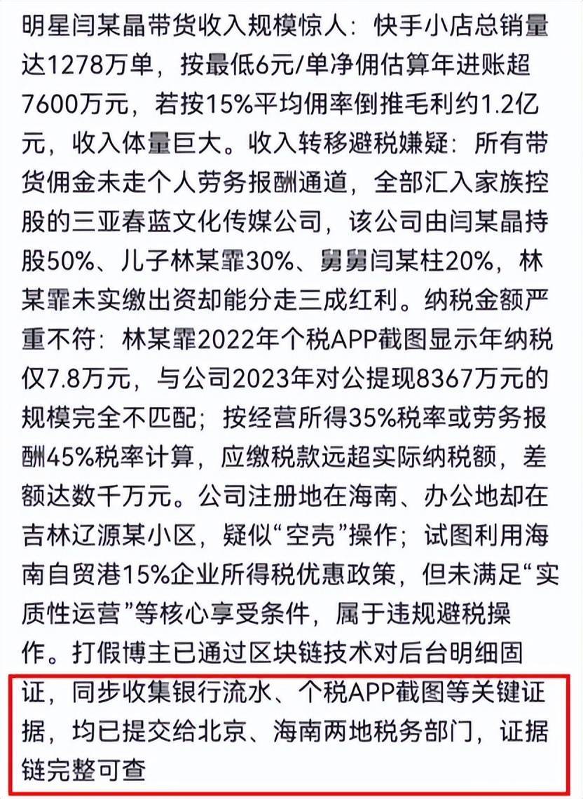 然而,一波未平一波又起,又有博主整理了完整证据链,怒指闫学晶和儿子通过空壳公司偷税漏税,把材料递到了北京、海南两地税务部门。